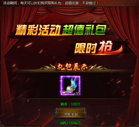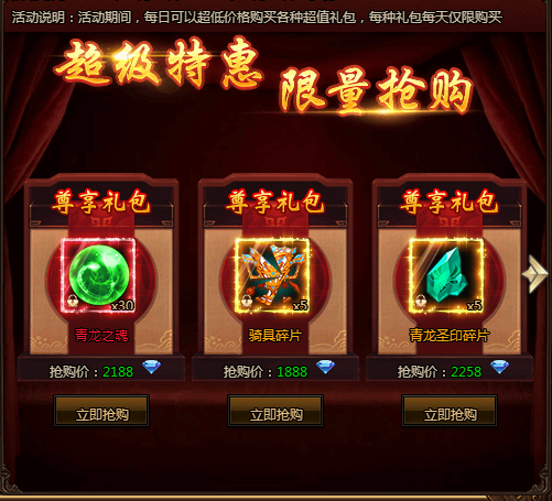 活动期间,每日可以超低价格购买各种超值礼包,每种礼包每天仅限购买!