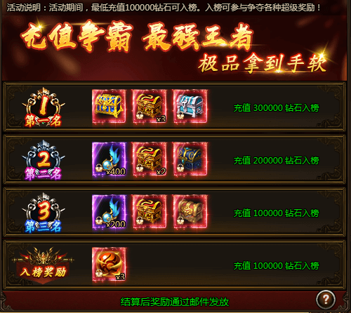 活动期间,最低充值100000钻石可入榜。入榜可参与争夺各种超级奖励!
