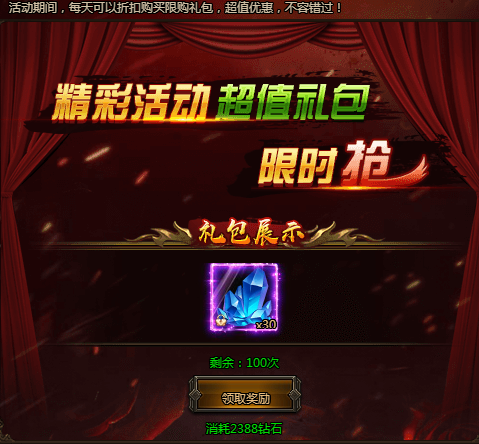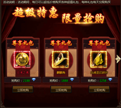 活动期间,每日可以超低价格购买各种超值礼包,每种礼包每天仅限购买!