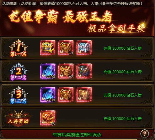 活动期间,最低充值100000钻石可入榜。入榜可参与争夺各种超级奖励!