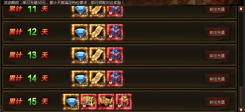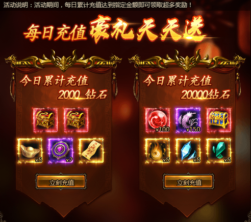 活动期间,每日累计充值达到指定金额即可领取超多奖励!
