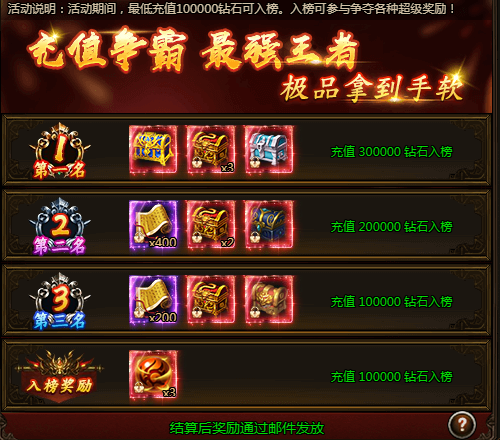 活动期间,最低充值100000钻石可入榜。入榜可参与争夺各种超级奖励!