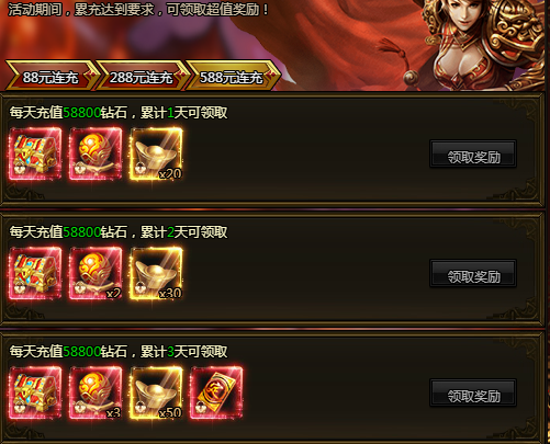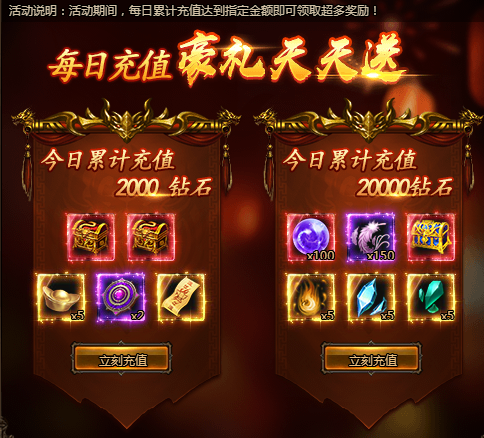 活动期间,每日累计充值达到指定金额即可领取超多奖励!