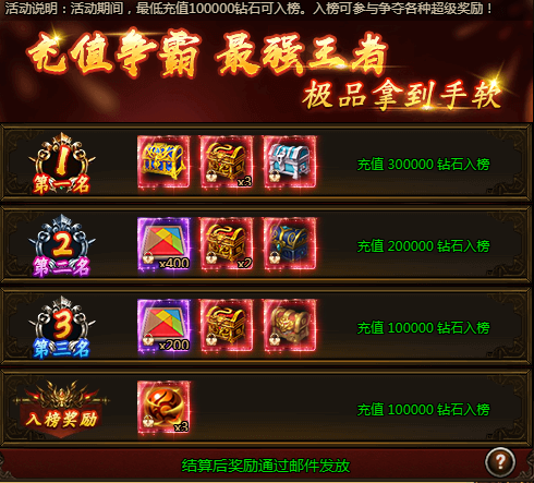 活动期间,最低充值100000钻石可入榜。入榜可参与争夺各种超级奖励!