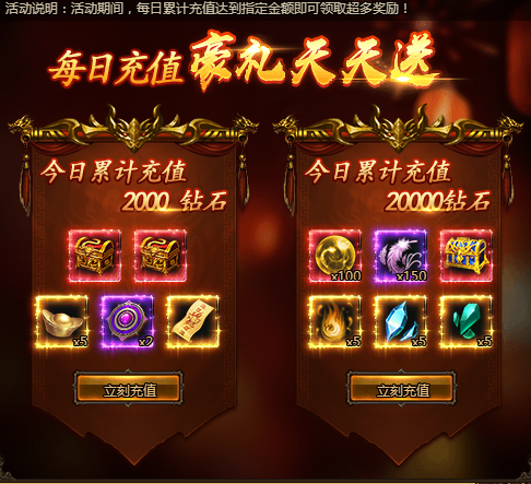 活动期间,每日累计充值达到指定金额即可领取超多奖励!