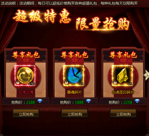 活动期间,每日可以超低价格购买各种超值礼包,每种礼包每天仅限购买!