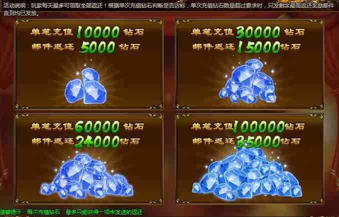 活动期间,玩家每天最多可领取全部返还!根据单次充值钻石判断是否达标,单次充值钻石数量超过要求时,只发剩余最高返还奖励,邮件直到均已发!