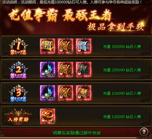 活动期间,最低充值100000钻石可入榜。入榜可参与争夺各种超级奖励!