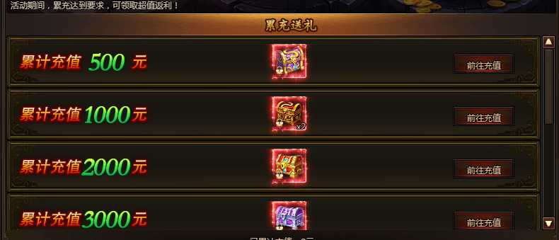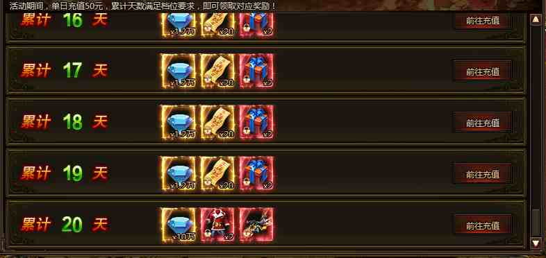 活动期间,每日累计充值达到指定金额即可领取超多奖励!