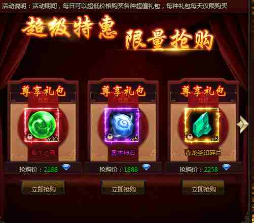活动期间,每日可以超低价格购买各种超值礼包,每种礼包每天仅限购买!