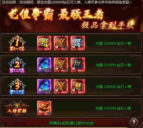 活动期间,最低充值100000钻石可入榜。入榜可参与争夺各种超级奖励!