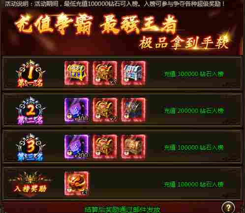 活动期间,最低充值100000钻石可入榜。入榜可参与争夺各种超级奖励!