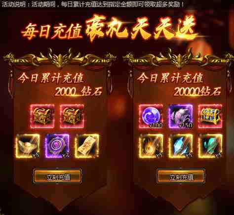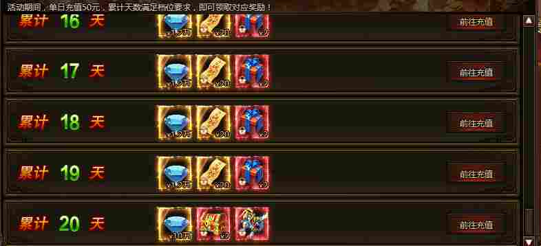 活动期间,每日累计充值达到指定金额即可领取超多奖励!
