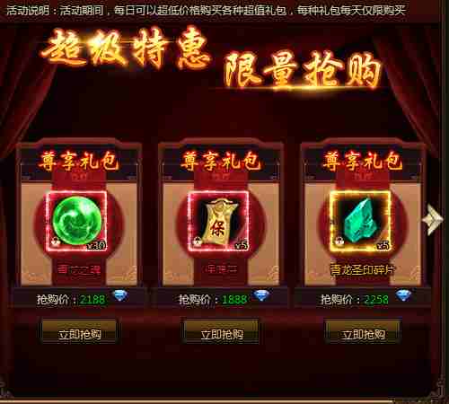 活动期间,每日可以超低价格购买各种超值礼包,每种礼包每天仅限购买!