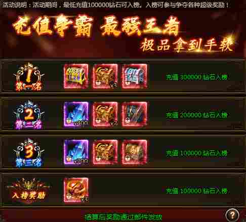 活动期间,最低充值100000钻石可入榜。入榜可参与争夺各种超级奖励!